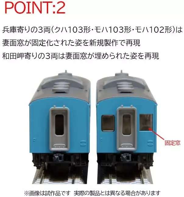 Os 3 carros do lado de Hyogo (Kuha 103, Moha 103 e Moha 102) reproduziram a aparência fixa da janela da superfície da esposa