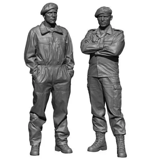 Ambos usam boinas na cabeça. Este é um conjunto de figuras que pode ser usado como um membro de tripulação de dois tanques de leopard que são kits na mesma escala.