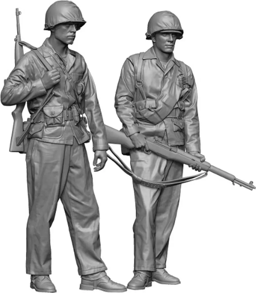 Este é um conjunto de figuras de resina de dois corpos que reproduz os fuzileiros navais dos EUA que desempenharam um papel ativo na frente do Pacífico durante a Segunda Guerra Mundial.