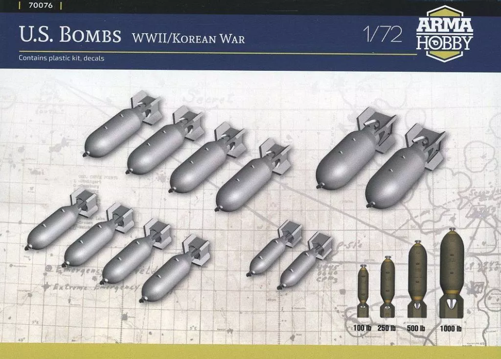 Este produto é um conjunto de duas bombas de 100 libras e duas bombas de 1000 libras e quatro bombas de 250 libras e quatro bombas de 5000 libras e vem com decalques.