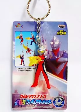 Um porta-chaves de figura com um ataque brilhante que é transportado para a figura Ultraman totalmente colorida.