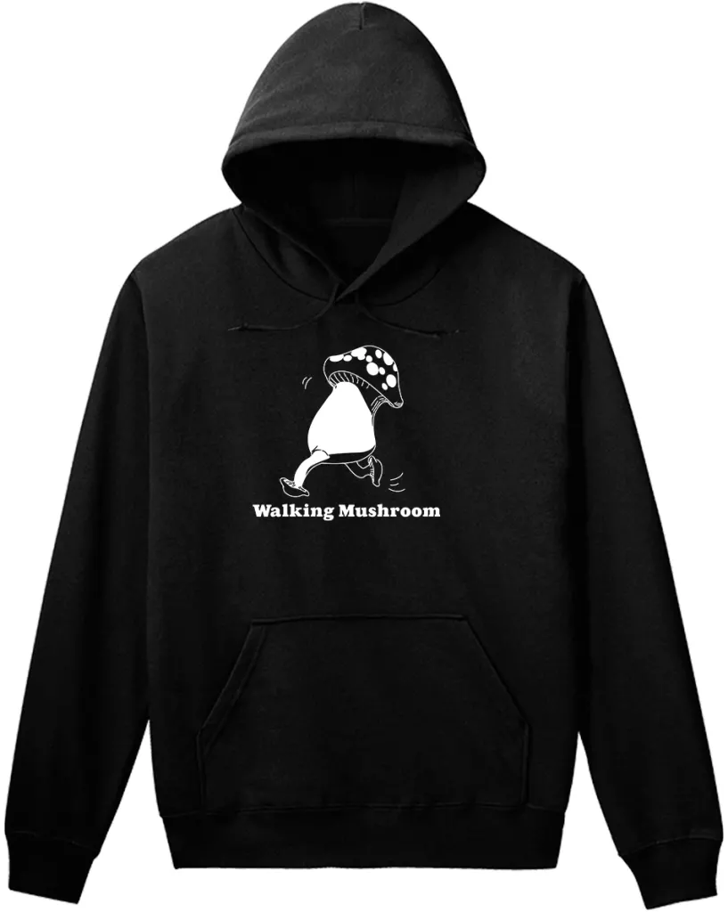 Esta é uma parka com uma ilustração de um cogumelo ambulante.