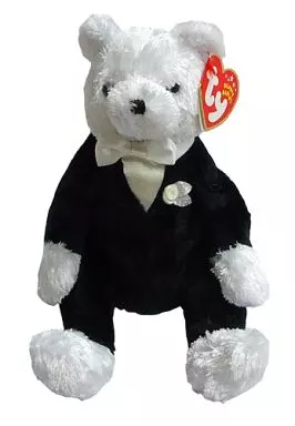 É um urso de smoking com uma rosa branca no peito e uma gravata borboleta branca no pescoço.