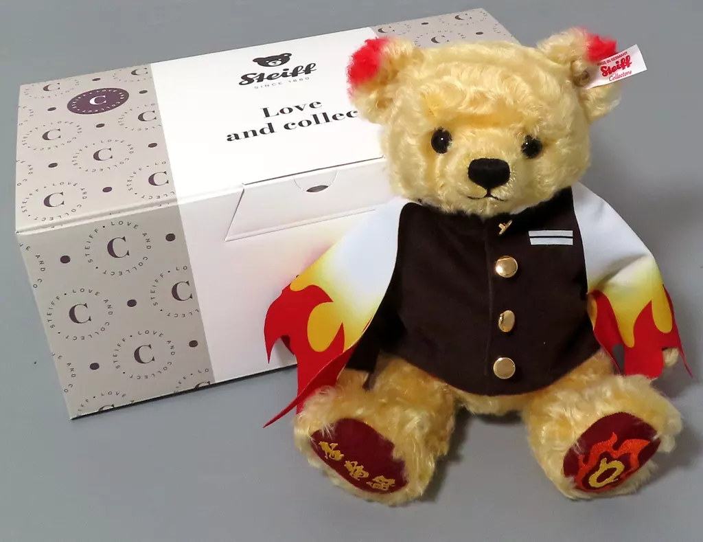 Descrição do produto ■ O valioso urso de peluche do fabricante mundial de ursos de peluche "Steiff", produzido em número limitado, aparece vestido com a fantasia de Kyojuro do Purgatório.