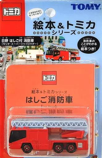 A descrição do produto, ■「 Picture book & Tomica Series, inclui o motor de incêndio morita Super Gyro Ladder (vermelho x cinza) com a escada de incêndio Hino 139.