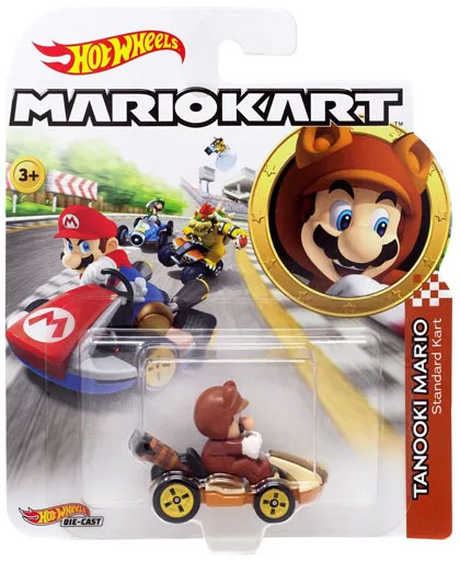Descrição do produto : "Hot Wheels Mario Kart" e 1/64 Tanuki Mario estão alinhados.