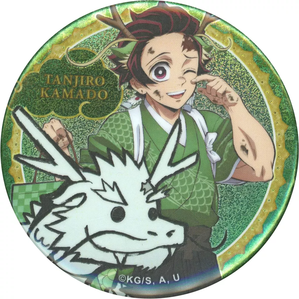 A ilustração do personagem de Tatsunen é transformada em um crachá de lata.
