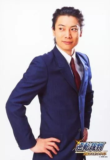 Nome do produto em japonês: 生写真(男性)/俳優 兼崎健太郎(成歩堂龍一)/上半身・衣装青・白・スーツ・ネクタイ赤・右向き・目線左・両手腰・キャラクターショット/舞台「逆転裁判 逆転のスポットライト」会場限定物販
