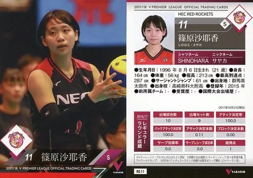 Nome do produto em japonês: スポーツ/レギュラーカード/2017/18 V・プレミアリーグ女子公式トレーディングカード RG 11 [レギュラーカード] : 篠原沙耶香