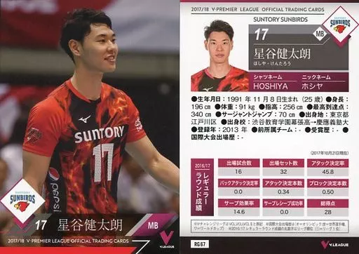Nome do produto em japonês: スポーツ/レギュラーカード/2017/18 V・プレミアリーグ男子公式トレーディングカード RG 67 [レギュラーカード] : 星谷健太朗