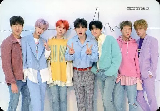 Monsta X / Set (7 pessoas) / Horizontal / Acima do joelho / Fundo branco / Linha ondulada / Fundo branco / Texto verde / CD "The Connect : Dejavu" incluído Cartão de foto especial