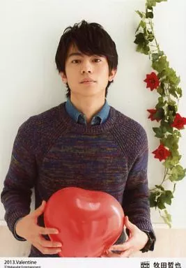 Nome do produto em japonês: 生写真(男性)/俳優/D-BOYS D-BOYS/牧田哲也/上半身・衣装青・紺・両手風船赤・口閉じ・後ろにバラ赤・壁白・「2013.Valentine」/公式生写真