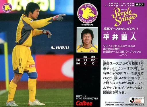 Nome do produto em japonês: スポーツ/レギュラーカード/カルビーJリーグチップス 2006 第1弾/京都パープルサンガ 97 [レギュラーカード] : 平井 直人