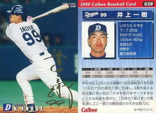 Nome do produto em japonês: スポーツ/2000プロ野球チップス ラッキーカード特典/中日/ゴールドサインカード 38:井上 一樹(箔押しサイン入)