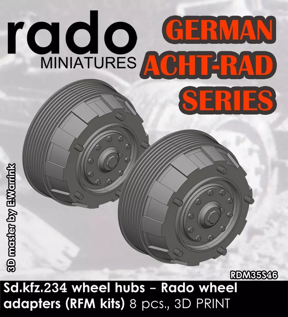 商品解说■第二次大战德军的Sd.Kfz.234再现了8轮重装甲车系列的车轮轮毂部分,这是Raisfield模型制造的套装专用的车轮适配器。最适合安装Rado Miniatures制造的各种自重变形轮胎SET。