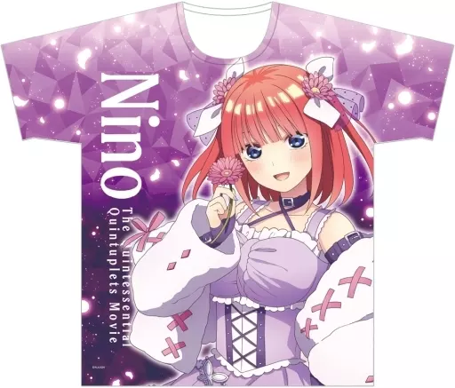 商品解说<电影五等分的新娘>推出的"全图案T恤"上市了。使用新插图【商品详情】尺寸:XL(身长约71 cm/身宽约57 cm/肩宽约53 cm/袖长约20 cm)颜色:紫色材质:聚酯100%(C)春场葱・讲谈社/电影<五等分的新娘>制作委员会
