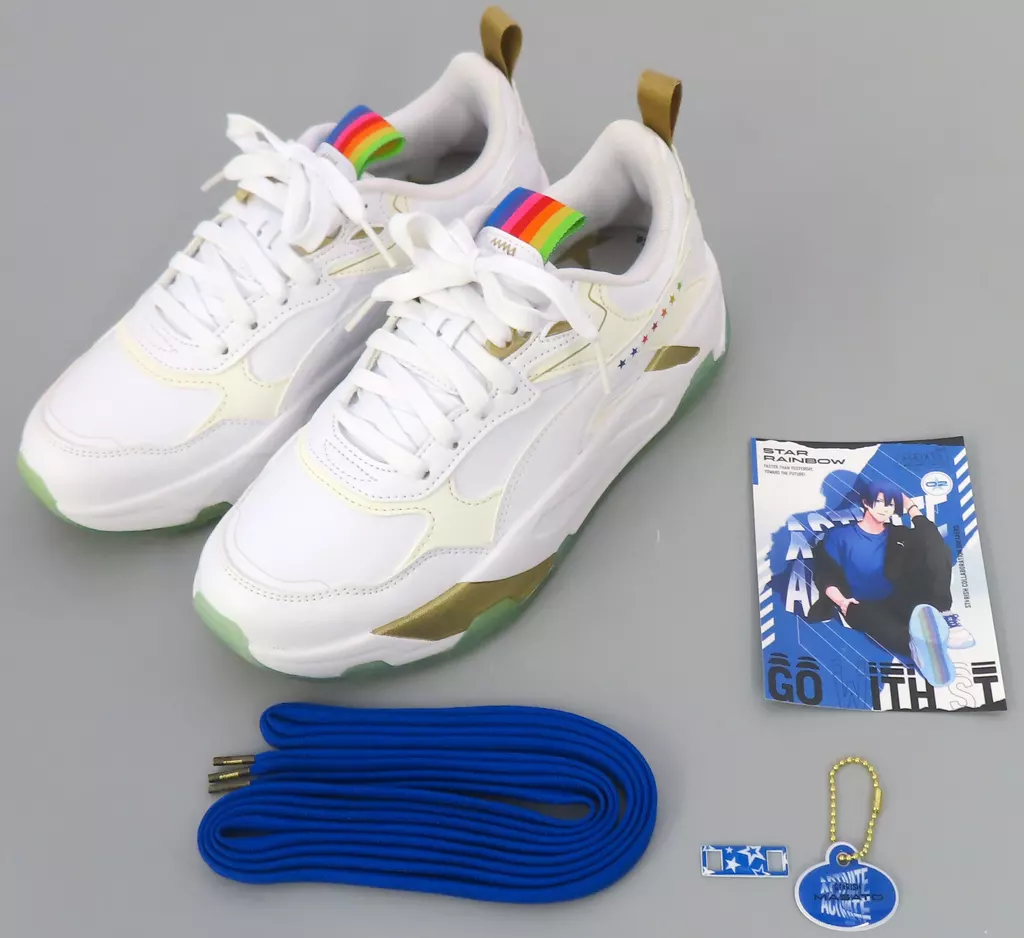商品解说■【商品详情】・运动鞋本体(鞋带:白色)・偶像彩色鞋带(2条)・鞋饰品(2种1 SET)・留言卡<表>偶像的视觉效果<里>印刷时有亲笔留言尺寸:23.5 cm材质:鞋背:人工皮革+合成纤维/中底:合成树脂(EVA树脂)/外底:橡胶底