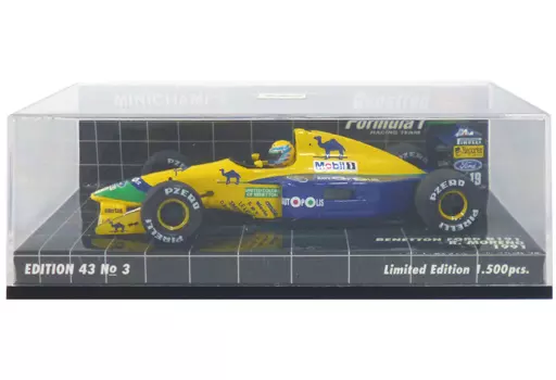 商品解说■BENETTON FORD B191 1991 Mobil#19(黄色×蓝色)以1/43比例的展示款式登场。车身采Mobil等LOGO设计。与刻有车名的专用底座一起封入透明盒内。【商品详情】尺寸:全长约10 cm司机:R.MORENO