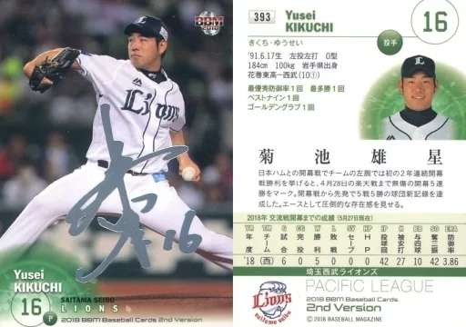 日本名: BBM/レギュラーカード/埼玉西武ライオンズ/BBM2018 ベースボールカード 2ndバージョン 393 [レギュラーカード] : 菊池雄星(銀箔押しサイン入り)