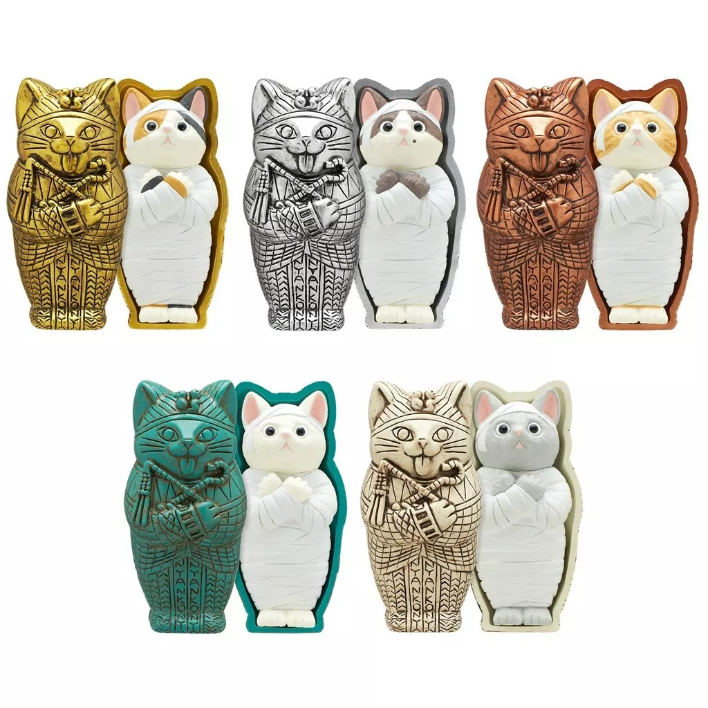 商品解說■貓×舉重服公仔系列登場!本作是放入貓型棺材裏的木乃伊貓。共5種SET。【SET內容】金×米紋銀×八層銅×夏特拉青銅色×白色象牙色×灰色【商品詳情】※本商品為扭蛋玩具。