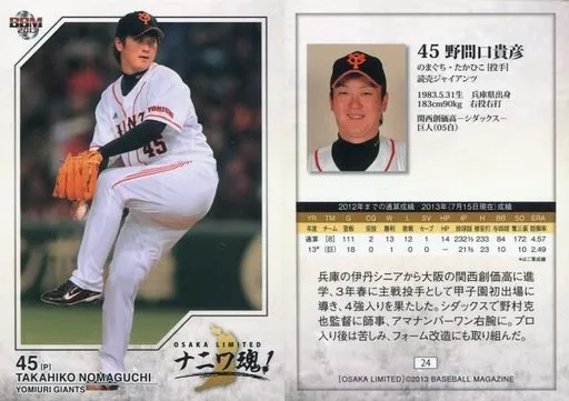 日本名: BBM/レギュラーカード/読売ジャイアンツ/BBM2013 ベースボールカード OSAKA LIMITED ナニワ魂 24[レギュラーカード]:野間口貴彦