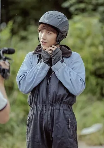 日本名: 生写真(男性)/歌手 イ・ジュン/膝上・衣装グレー・ヘルメット・顔左向き・両手顎・屋外/DVD「イ・ジュンの特別な旅」特典生写真